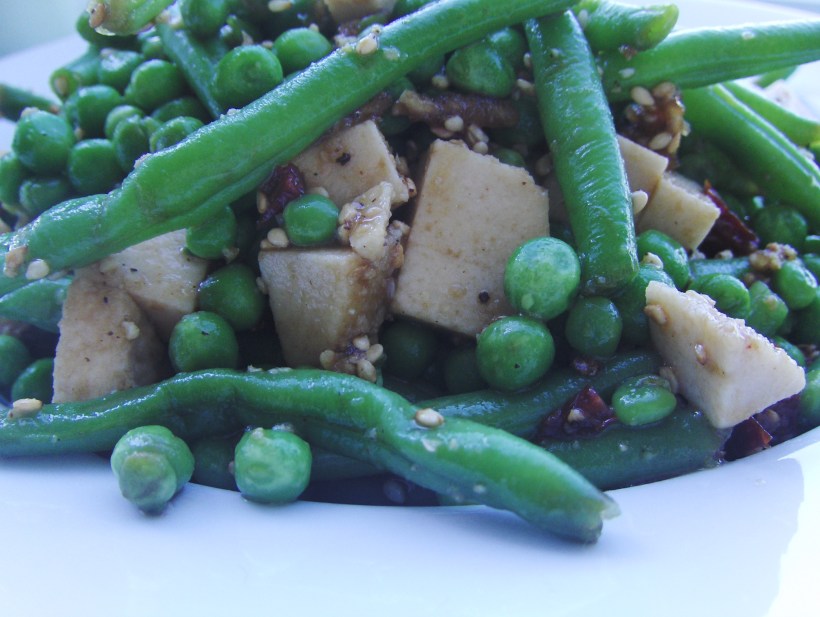 Kom de frosne grønne bønner i kogende vand og tilsæt salt. Det er meget vigtigt at bønnerne bevarer deres sprødhed, så vandet skal kun lige begynde at koge igen efter at bønnerne er kommet i. Så er de færdige… Skyld dem med det samme i koldt vand og pres vandet ud af dem med hænderne og kom dem i en skål. Det gør ikke noget at de kommer til at se rynkede ud når ligger i skålen, de skal nok folde sig ud igen. Ærterne kommes i en si og skyldes med koldt vand til de er optøede. Nuttolenen skæres i tern, de soltørrede tomater i strimler. Det hele blandes med bønnerne.