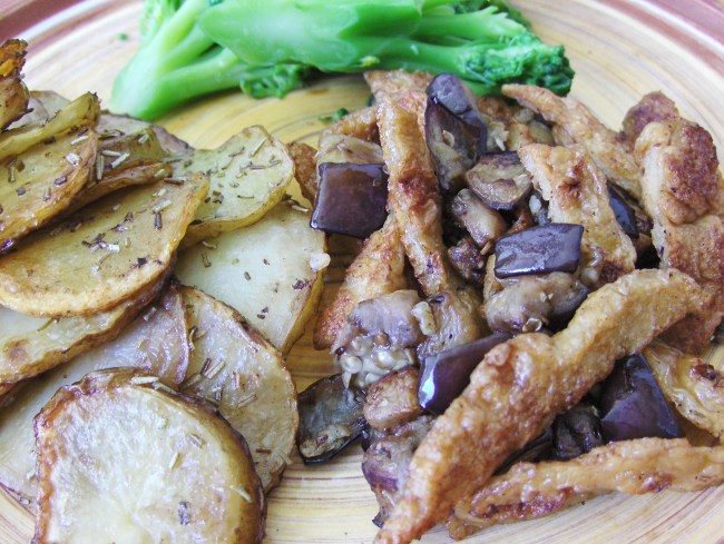 Ja, det er lidt en kunst med dét seitan. Det er jo en svampet sag, men den skal jo helst ikke være vammel. Jeg finder at strukturen bliver mindre svampet når den steges ja.