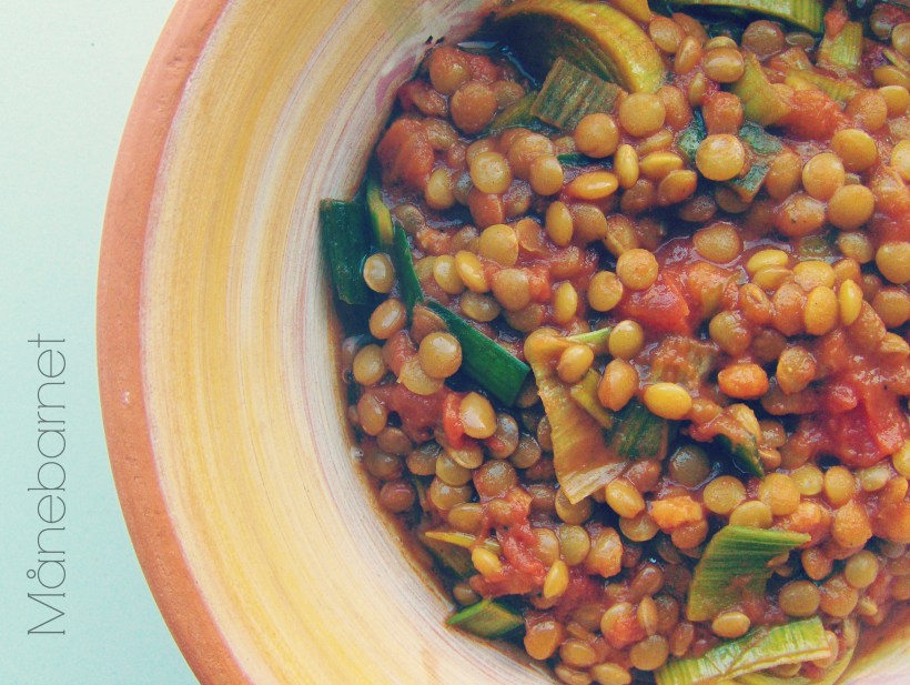 Når linserne endnu har lidt bid, men ikke er rå, snittes porre og de sættes til side mens retten smages til med Herbamare urtebouillon, Sambal Oelek,  karry og Garam Marsala. Porre og hvidløg simrer med i retten de sidste 5 min. Tilsæt lidt sojafløde for at give retten en mere cremet konsistens, og mango chutney for at give sødme. Tæppebomb evt. retten med hakket persille eller et drys gomasio inden servering. Retten er også lækker dagen efter som en sund og nem frokost.