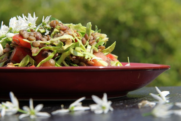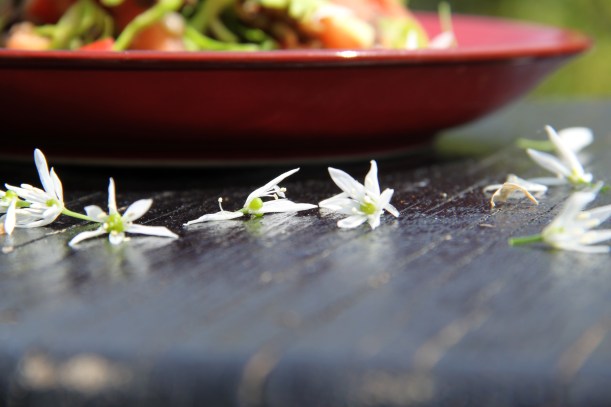 Pynt salaten med smukke hvide ramsløg blomster, som ligesom ramsløget også er spiselige og har, afhængigt af hvor sent i sæsonen de plukkes, en sødme samt en pikant smag af purløg! Blomsterne jeg har brugt til denne opskrift, lå i en kasse fra Aartiderne, men blomsterne kan endnu plukkes selv i danske skove. Er du så heldig, som jeg er, at bo i nærheden af Riis Skov i Aarhus, har du et af Danmarks største forekomster af ramsløg lige ved døren. Læs i øvrigt mere om ramsløget og hvordan du bruger det i denne artikel.