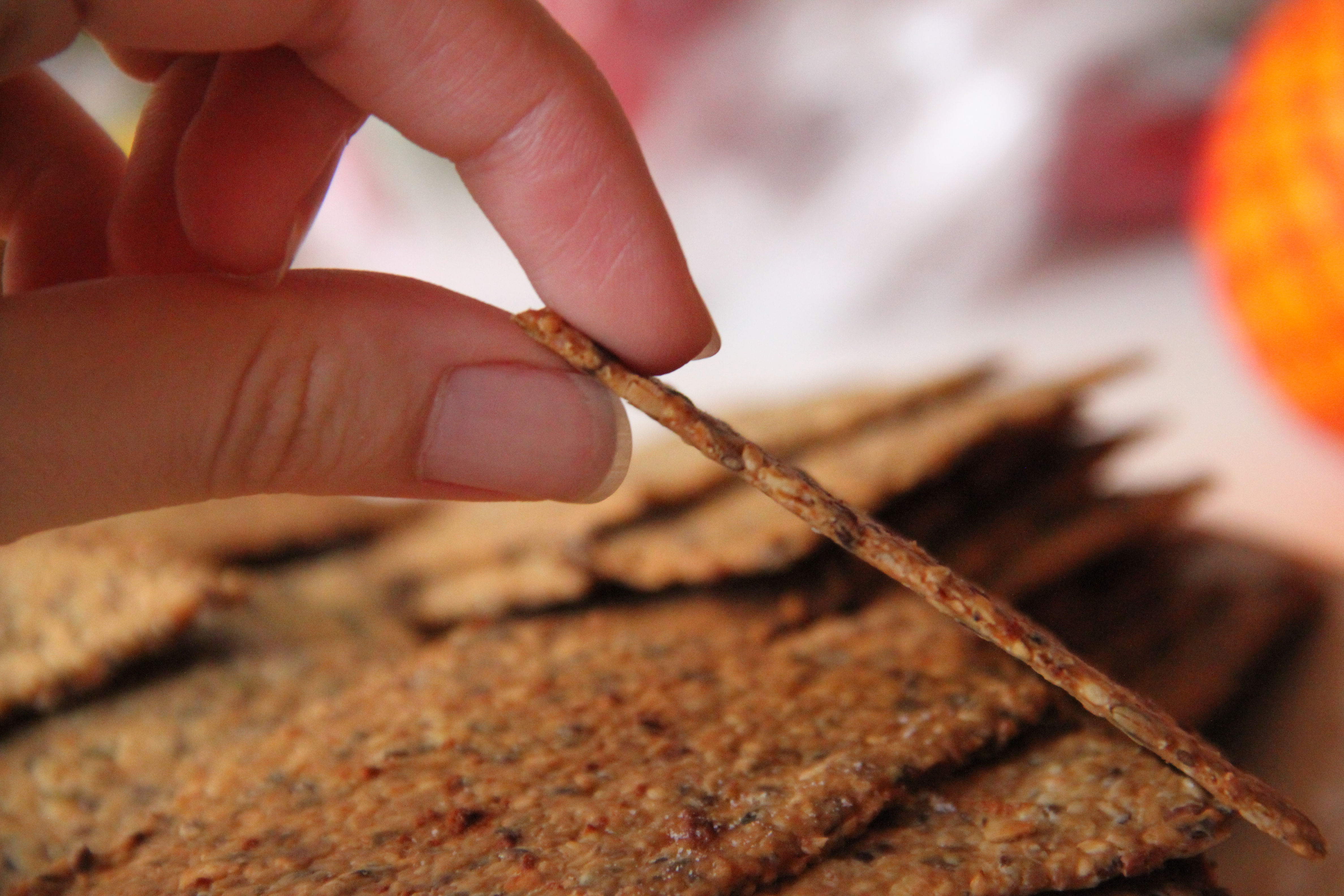 - Når kiksedejen har fået den ønskede tykkelse, (jeg kan anbefale at rulle den meget tyndt ud, da bliver kiksene bliver mere sprøde) fjernes det øverste bagepapir, og dejen skæres ud i ruder, kvadrater eller stikkes ud med en form. Drys evt. med groft flagesalt, oregano, rosmarin, timian, basilikum, nigellafrø/jomfru i det grønne, fennikelfrø eller røget paprika!