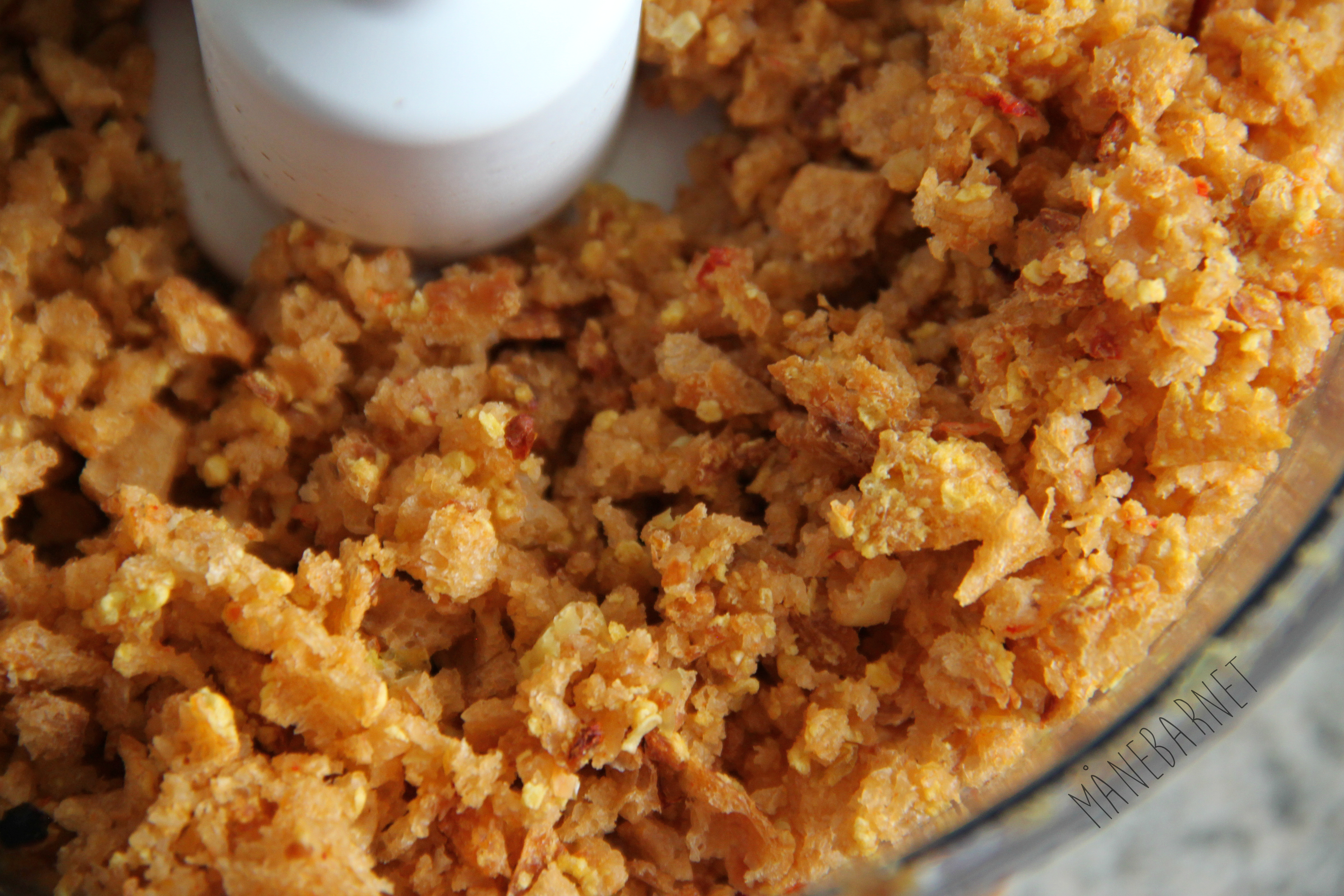2. Skær brødet i store stykker, og finhak det derefter i en foodprocessor indtil det har fået en smuldret konsistens, og kom det også i skålen.