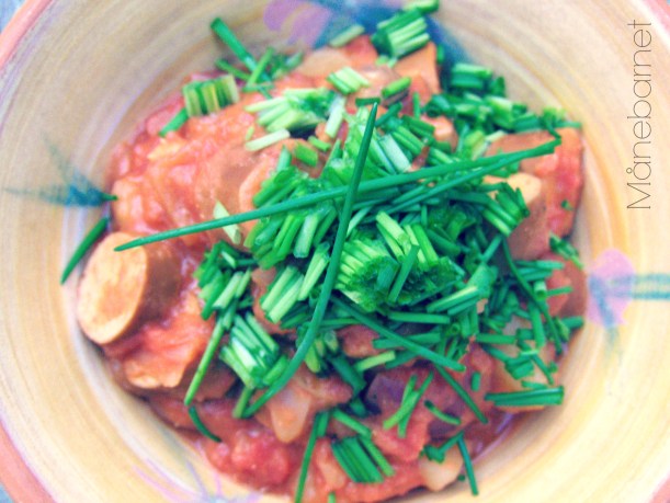 Kom de hakkede flåede tomater i en gryde sammen med hakket løg og plantepølser i skiver og lad det koge i et par minutter. Tilsæt kartoflerne og de øvrige ingredienser. Kog i yderligere et par minutter til kartoflerne får retten til at tykne. Server den svenske pølseret med masser af purløg på toppen, og lav også gerne en salat ved siden af da retten er meget tung for sig selv. Velbekomme!
