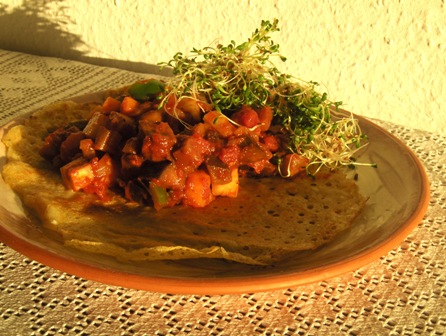 Disse madpandekager er saftige, sprøde og perfekte som tilbehør eller til at komme i madpakken. Da de indeholder kikærtemel mætter de rigtig godt, og så er de rige på umami fra oliven og soltørret tomat. De kan selvfølgelig også bruges som hovedmåltid med fyld af f.eks. spinat og vegansk ost. Du kan sagtens erstatte grøntsagerne med hvad du nu lige har, og pandekagerne er derfor helt perfekte til tøm-køleskabet dage, hvor f.eks. de sidste to kartofler i en pose, 1/2 tomat, et ensomt løg og et slattent stykke zucchini ender med at blive til et sandt festmåltid.
