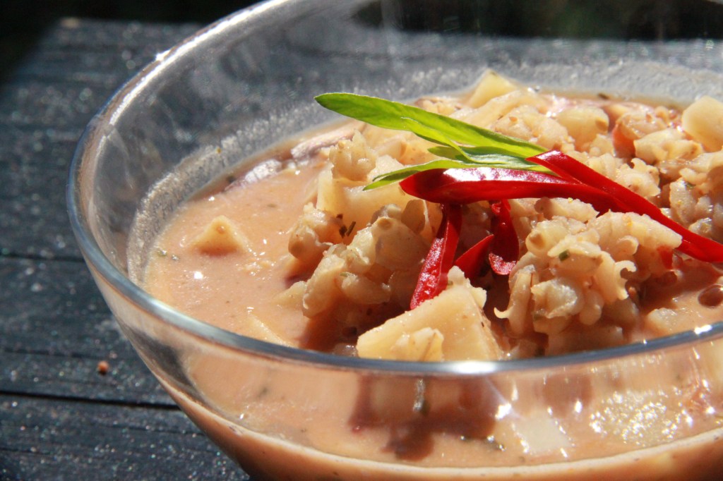 - Servér tomatsuppen med f.eks. sprød ovnbagt smuldret rugbrød, olivenolie og friske krydderurter.