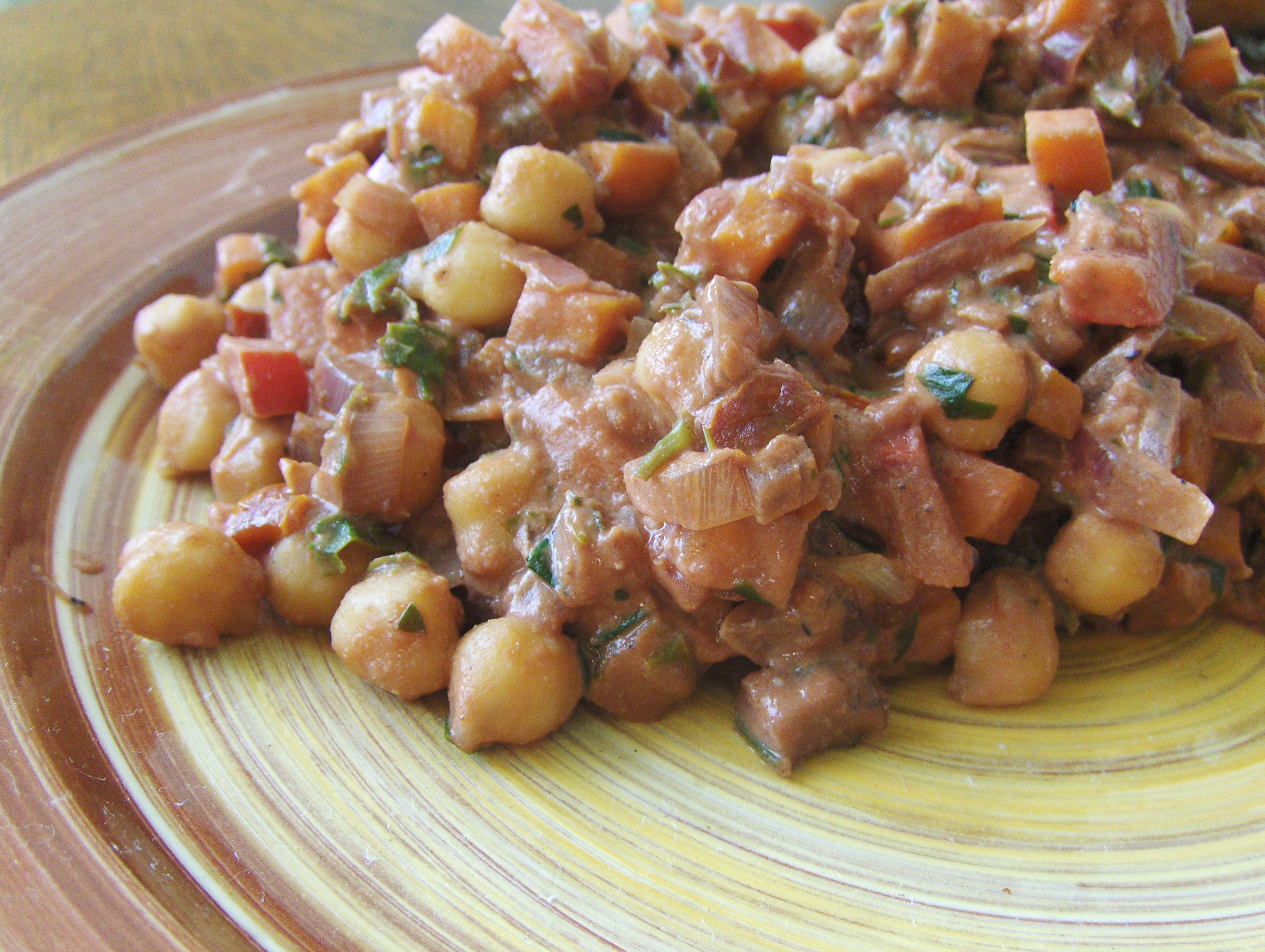 Kikærterne, som har stået i blød natten over eller i 8 timer, blendes til en jævn masse med en stavblender. De skal ikke koges først, men vandet hældes fra dem, og de skylles i koldt vand. Tilsæt vand og olivenolie for at gøre massen mere cremet. Hak løget fint, men giv det også en tur med stavblenderen nede i skålen med de blendede kikærter. (Kun ganske lidt) Kartoffel, gulerod og broccoli er blevet kogt møre og skal nu tilsvarende moses med stavblenderen. (I gryden hvor de er kogt i.) Der skal stadig være nogle klumper tilbage da det giver en lækker konsistens. Tilsæt kartoffel/gulerod/broccoli mosen og tilsæt også Quinoa som er kogt i 1 dl. vand til 50 g. Quinoa. Koges i 10 min ved middel varme med lidt salt.