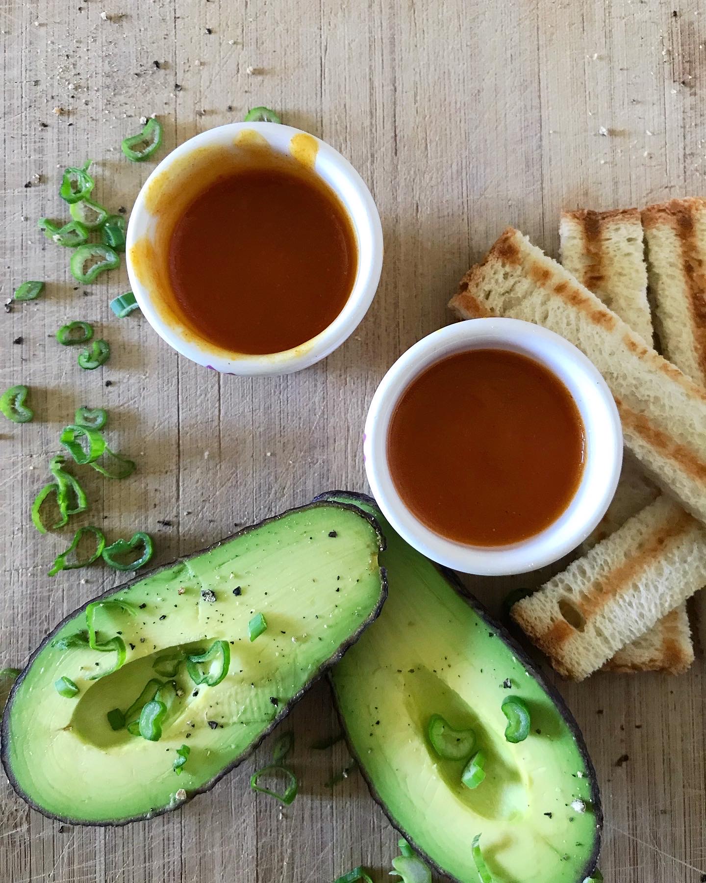 Tomatjuice Tilføjer både umami og giver en smuk orange farve, når den kombineres med de øvrige ingredienser. Find den i juiceafdelingen i almindelige supermarkeder.