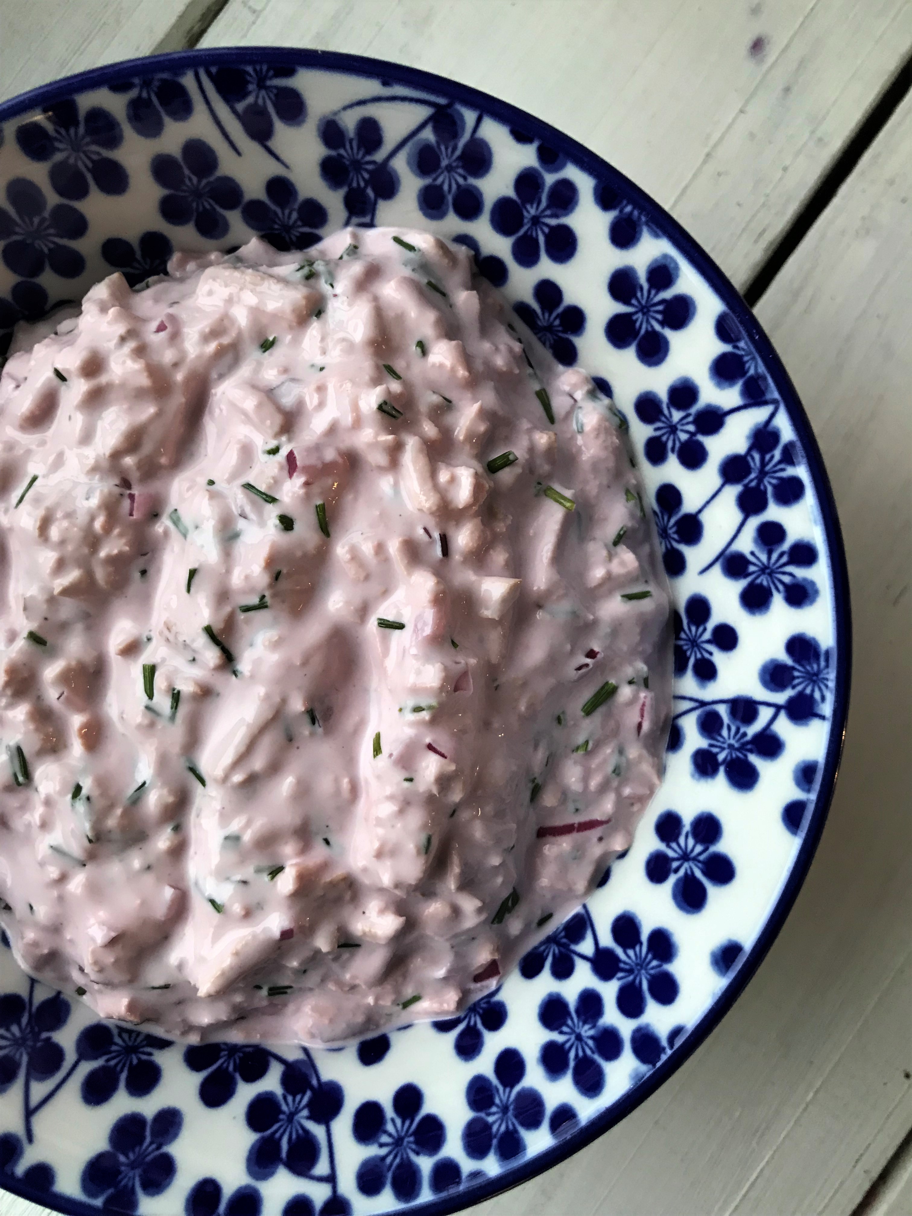 - I en separat skål røres mayonnaise (jeg bruger den plantebaserede fra Hellmann’s) sammen med neutral og sukkerfri sojayoghurt, samt de øvrige ingredienser.
